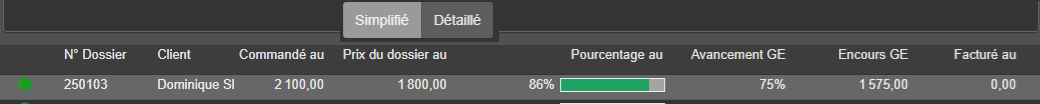 - Pourcentage Au : prix dossier / total commandé, en rouge à la même condition