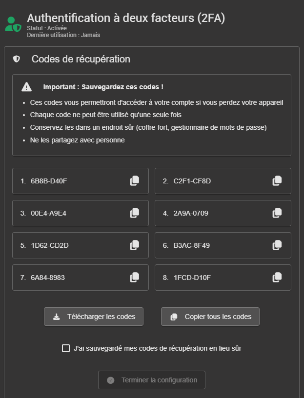 Faire Suivant. Géoprod vous fournit alors les codes de récupération en cas d’impossibilité, lors des futures connexions, d’accéder à l’application d’authentification sur votre téléphone. Lire attentivement les indications, puis sauvegarder les codes en lieu sûr :