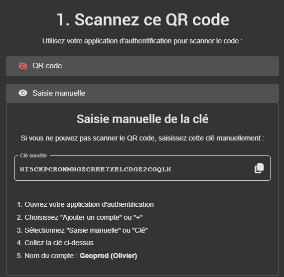 Lors de l’étape de scan du QR code, si votre téléphone n’est pas en capacité de lire ce QR code, vous pouvez contourner le problème et cliquant sur Saisie manuelle (voir écran plus haut).
