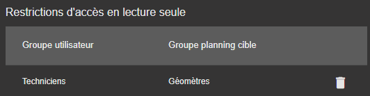 Exemple, les utilisateurs sont divisés en deux groupes : géomètres et techniciens. On peut alors ajouter une règle restreignant l’accès en lecture seule aux techniciens sur les événements des géomètres.